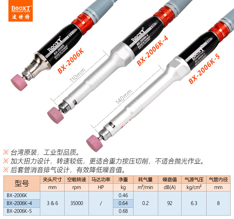 東莞市強勁五金工具有限公司提供臺灣BOOXT波世特品牌氣動工具,加長氣動刻磨筆BX-2006K-5廠家直銷,首件享特價。咨詢熱線:4008301980
